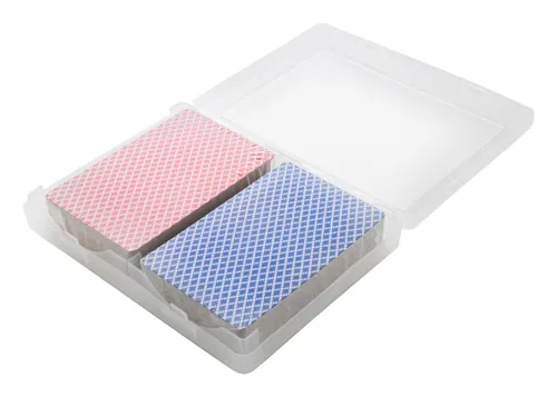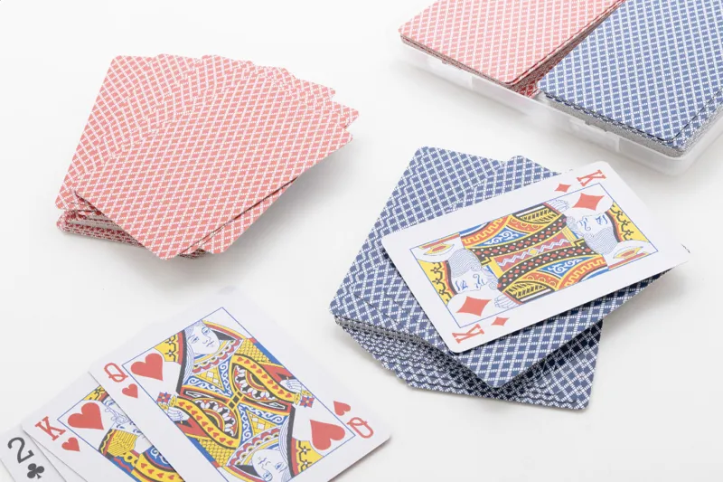 Francia kártya szett újrahasznosított PP dobozban. Két szabványos 54 lapos paklit tartalmaz piros és kék hátoldallal.