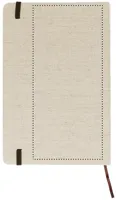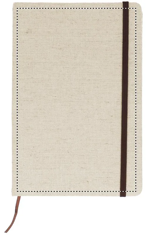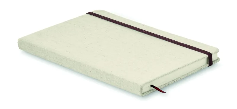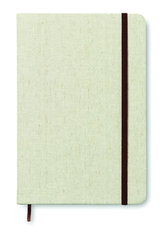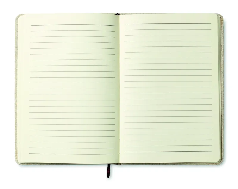A5 jegyzetfüzet keménytáblás vászonborítóval. Cérnafűzött. 192 vonalas oldal (96 lap) újrahasznosított papírból. Kontrasztos elasztikus zárópánt és könyvjelző szalag.