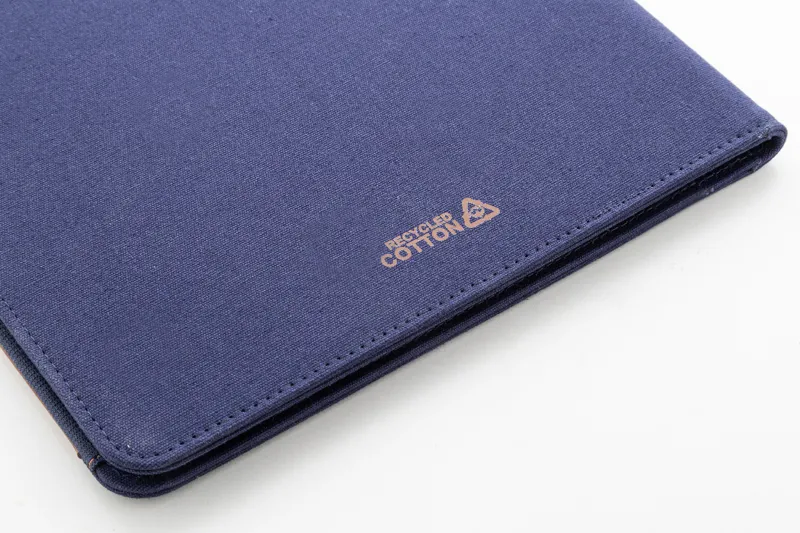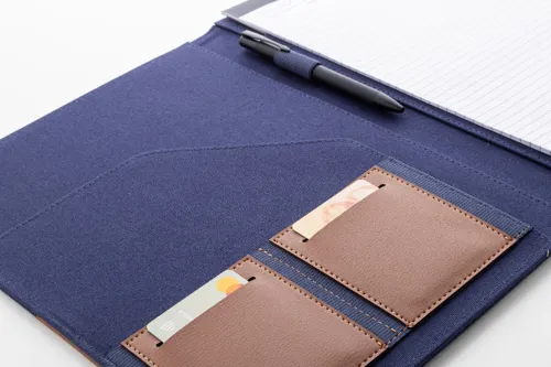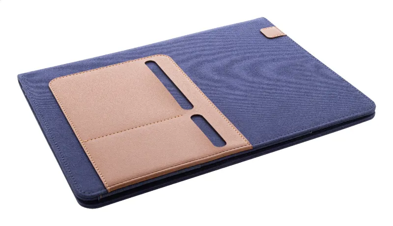 A4 méretű, újrahasznosított vászonból és újrahasznosított PU bőrből készült iratmappa több elülső és belső rendező zsebbel. 20 újrahasznosított papír anyagú, vonalas lapos jegyzetfüzettel. 70% újrahasznosított pamut és 30% RPET poliészter.