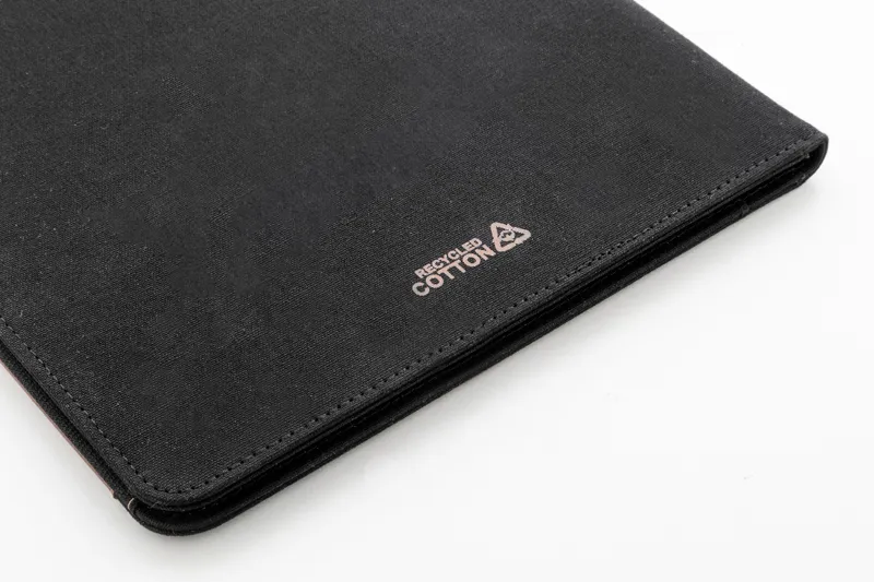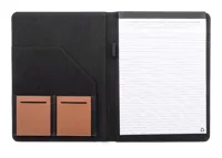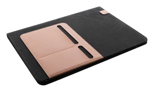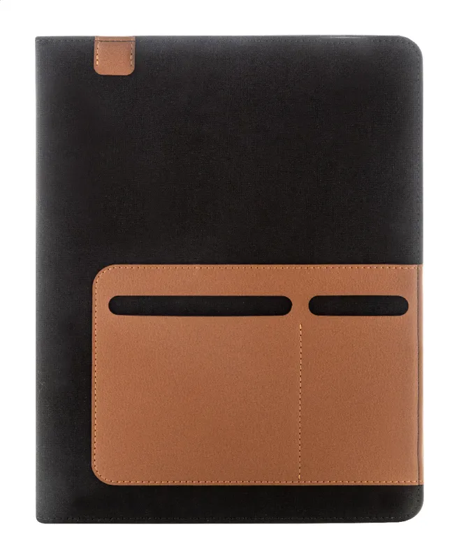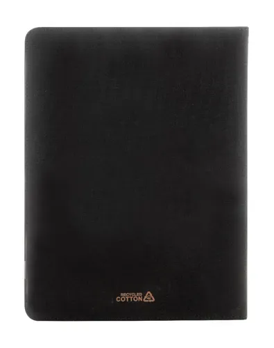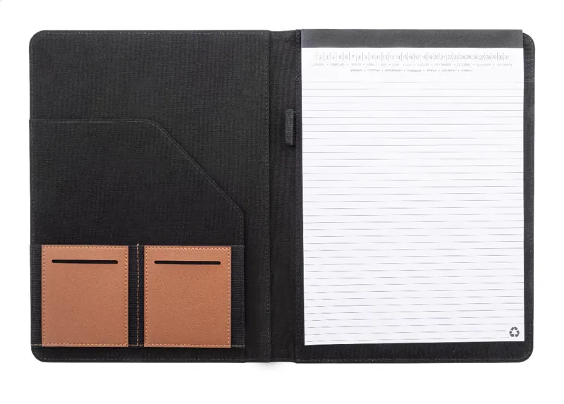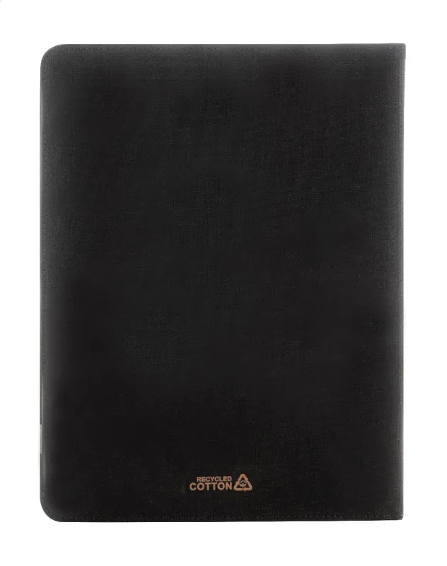 A4 méretű, újrahasznosított vászonból és újrahasznosított PU bőrből készült iratmappa több elülső és belső rendező zsebbel. 20 újrahasznosított papír anyagú, vonalas lapos jegyzetfüzettel. 70% újrahasznosított pamut és 30% RPET poliészter.