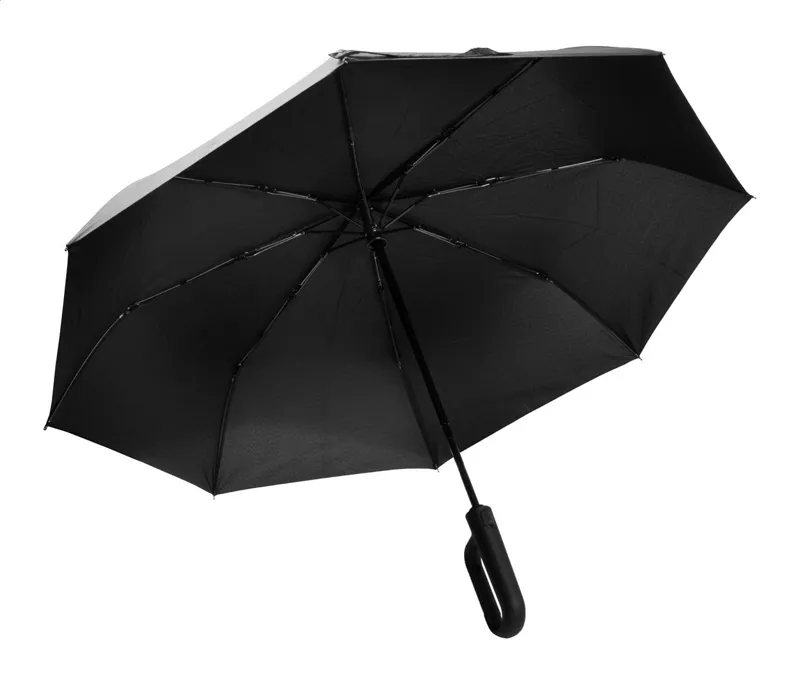 Teljesen automata (nyitás/zárás), szélálló, összecsukható esernyő 8 panellel, színben megegyező tasakban. Fém kerettel, üvegszálas bordákkal és gumírozott karabineres fogantyúval. 190T RPET pongee. Megkülönböztető RPET címkével.