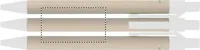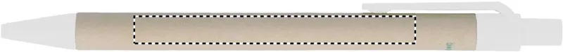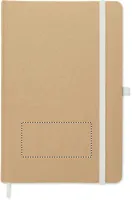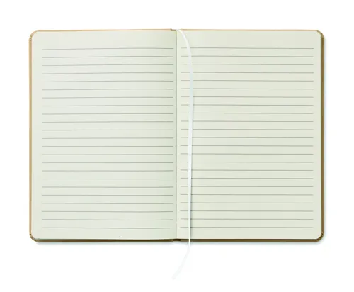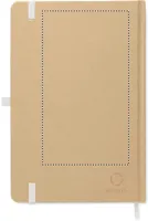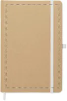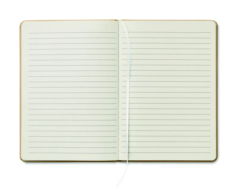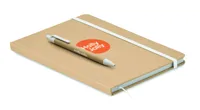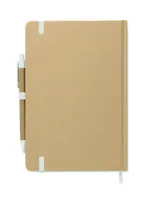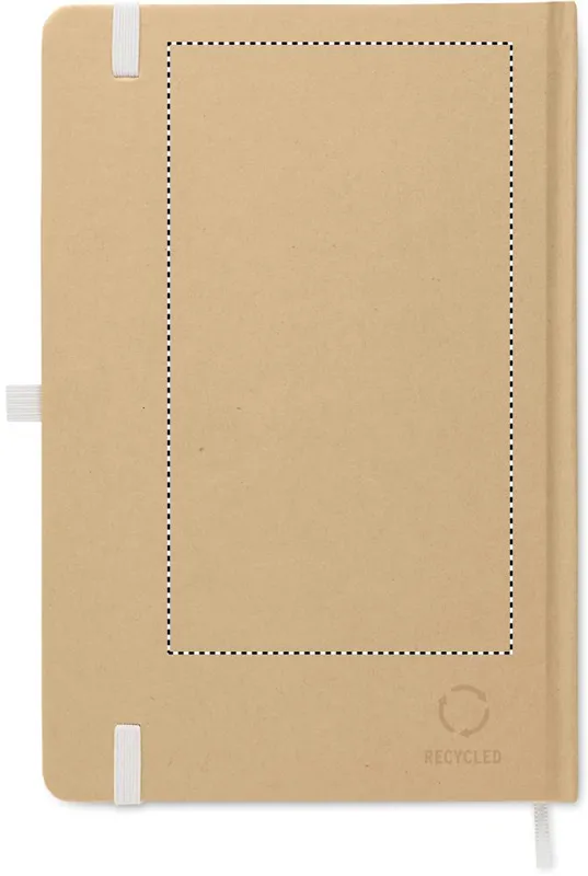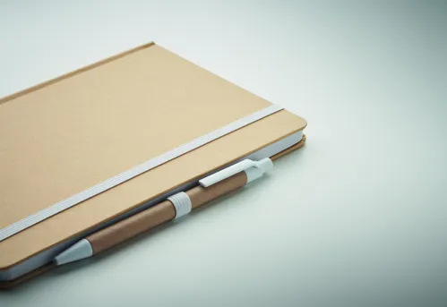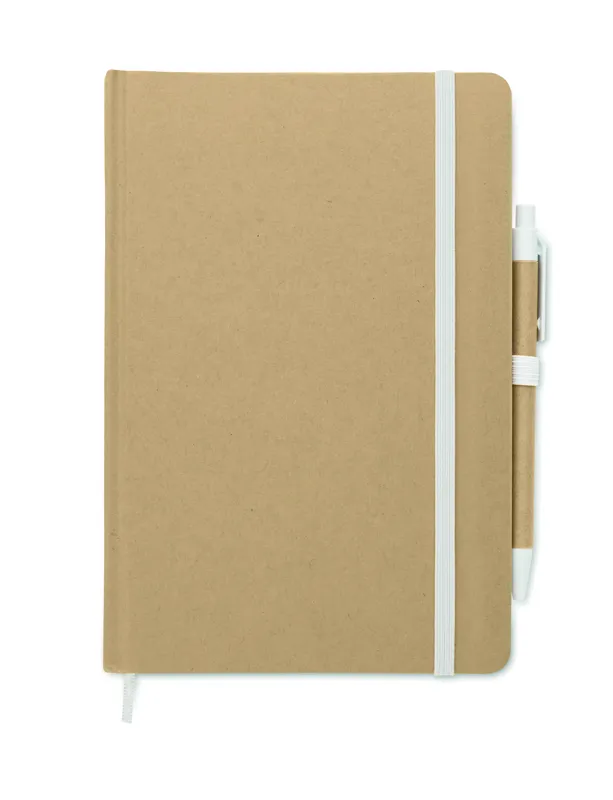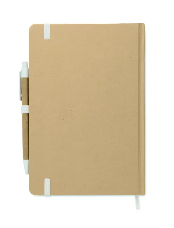 A5 jegyzetfüzet keménytáblás, újrahasznosított karton borítóval. Cérnafűzött. 160 vonalas oldal (80 lap) újrahasznosított papírból. Elasztikus zárópánt, tolltartó hurok és könyvjelző szalag. Nyomógombos golyóstoll újrahasznosított papír tolltesttel. Kéken író betét.