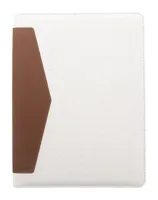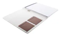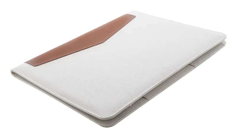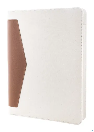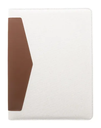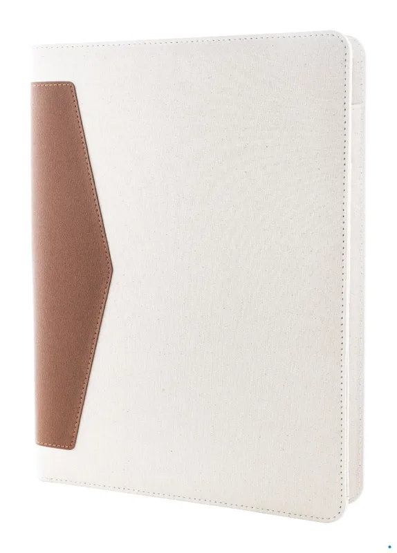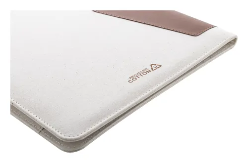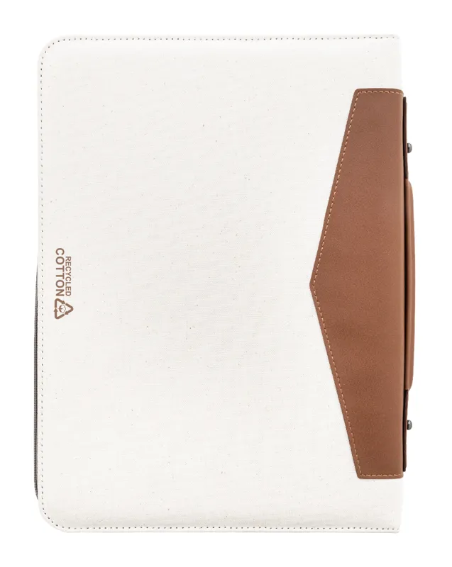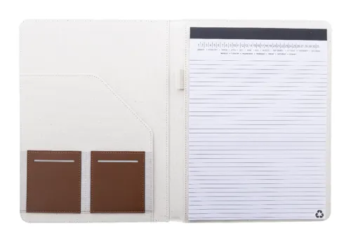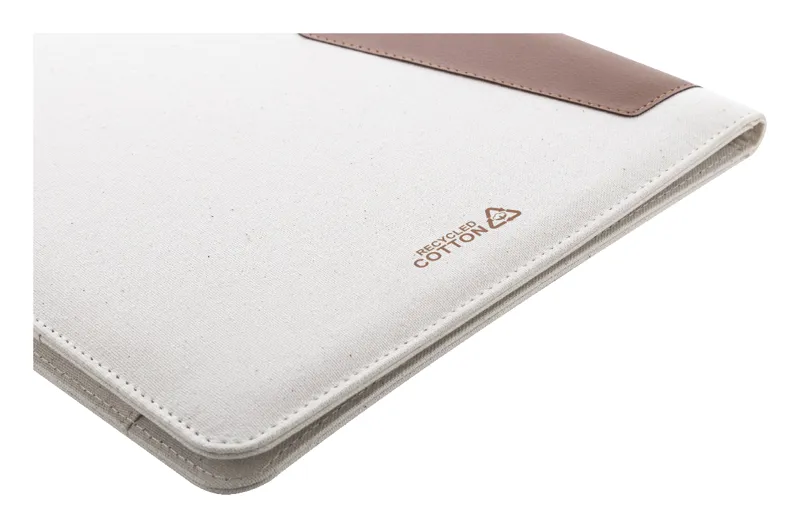 A4-es méretű, újrahasznosított vászon és újrahasznosított PU bőr iratmappa több belső rendezőzsebbel. 20 vonalas jegyzettömbbel újrahasznosított papírból. 70% újrahasznosított pamut és 30% RPET poliészter.