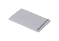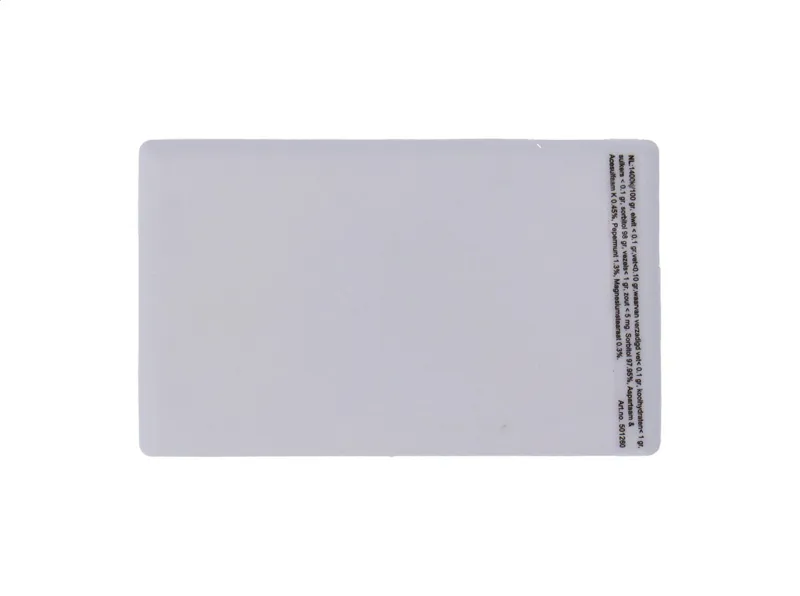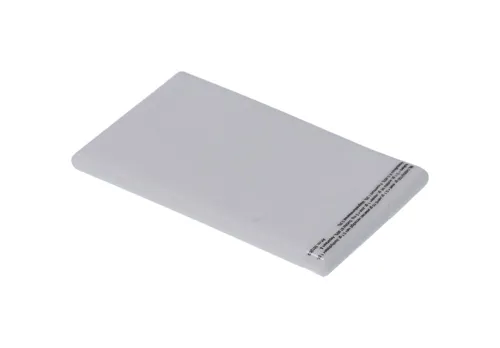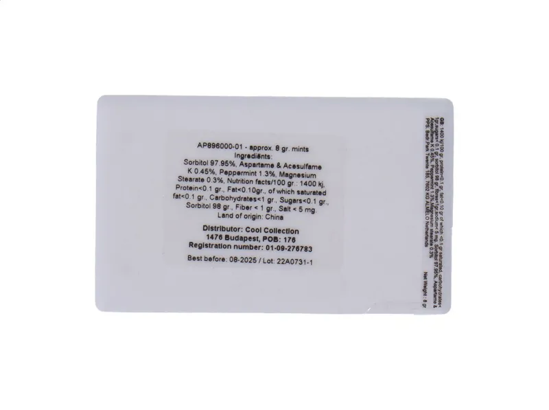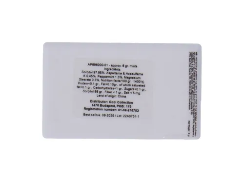 Lapos, műanyag, téglalap alakú cukorka tartó, körülbelül 8 gramm mentolos cukorkával.