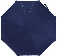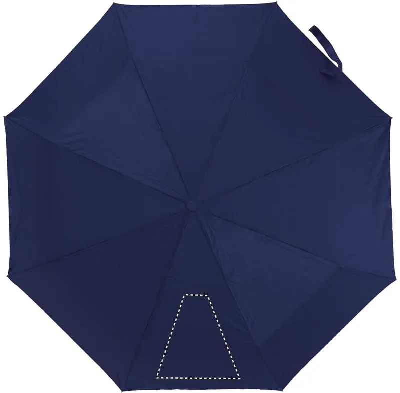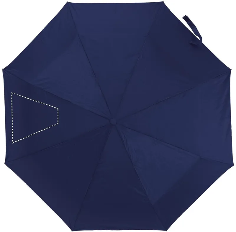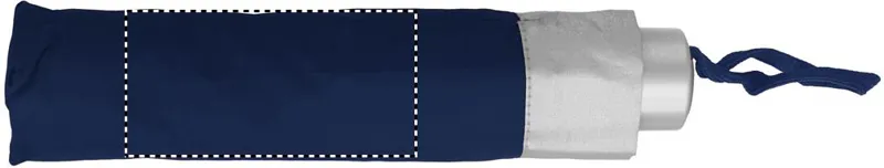 21 colos, manuális, 3 szakaszos összecsukható esernyő 190T poliészter anyagból. Galvanizált fém nyél és csúcsok. Fekete bevonatú fém váz. Színes műanyag panelek belül ezüst betéttel. Színes műanyag markolat ezüst díszítéssel és fekete csuklópánttal. Hozzáillő tokban, ezüst díszítéssel.