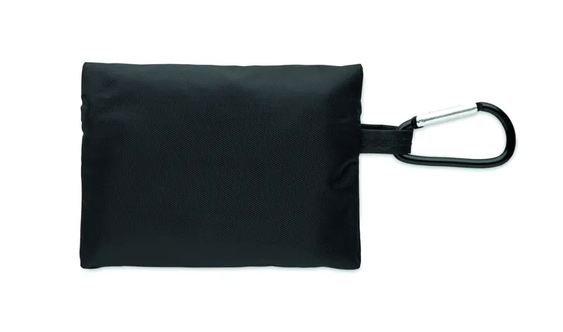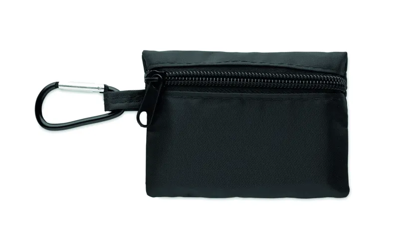 Kompakt elsősegély készlet RPET tasakban alumínium karabinerrel. Tartalma: 4 alkoholos törlő, 3 sebtapasz, 2 kötszer, 2 gézlap, 1 ragasztószalag és 1 olló. Csak EU-n belüli értékesítésre.