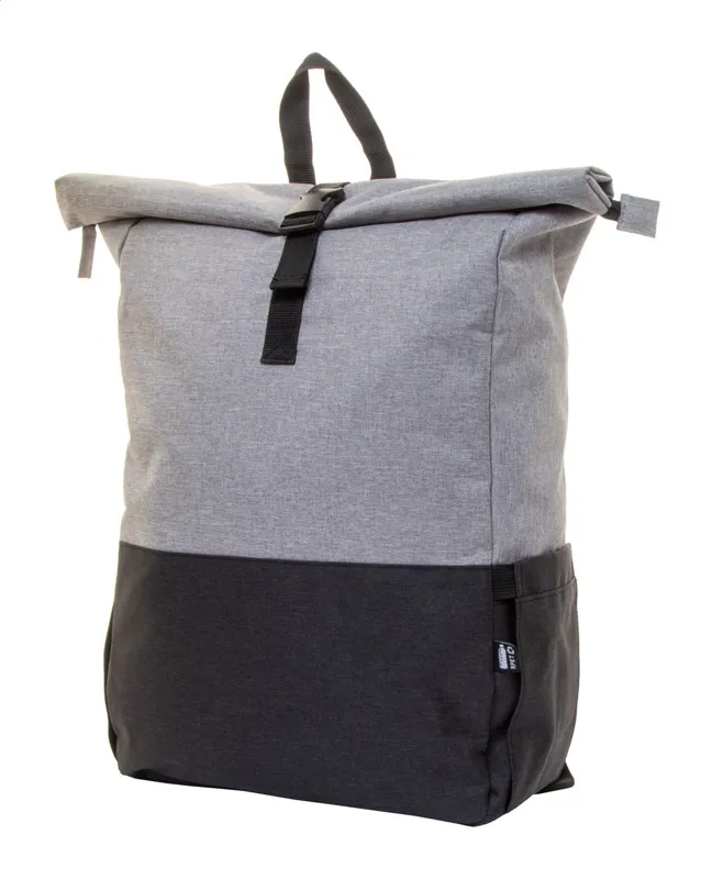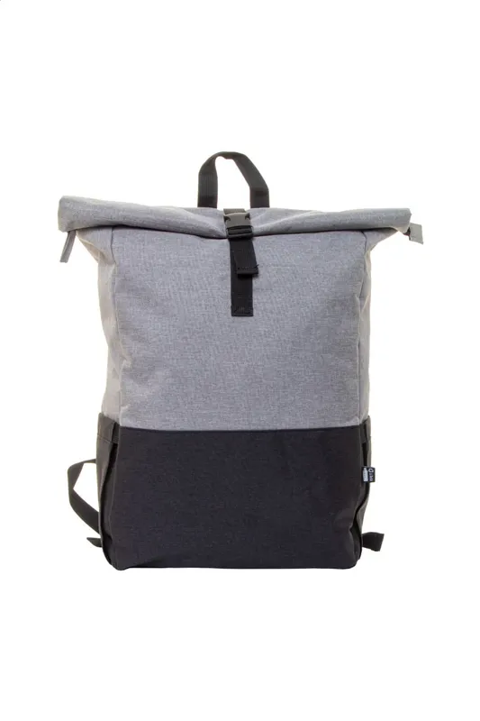 Két tónusú, RPET hátizsák csatos záródással, cipzáras fő rekesszel, párnázott laptop (15") és tablet (10") rekesszel, oldalzsebekkel, párnázott hát- és vállpánttal. 300D RPET poliészter, megkülönböztető RPET címkével.