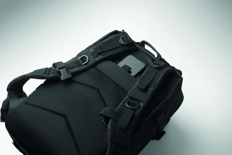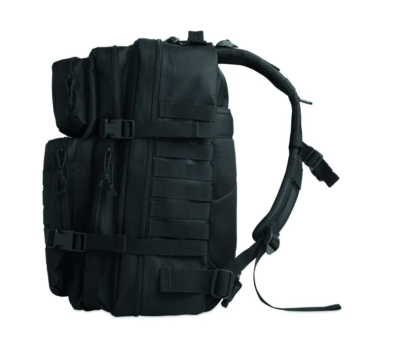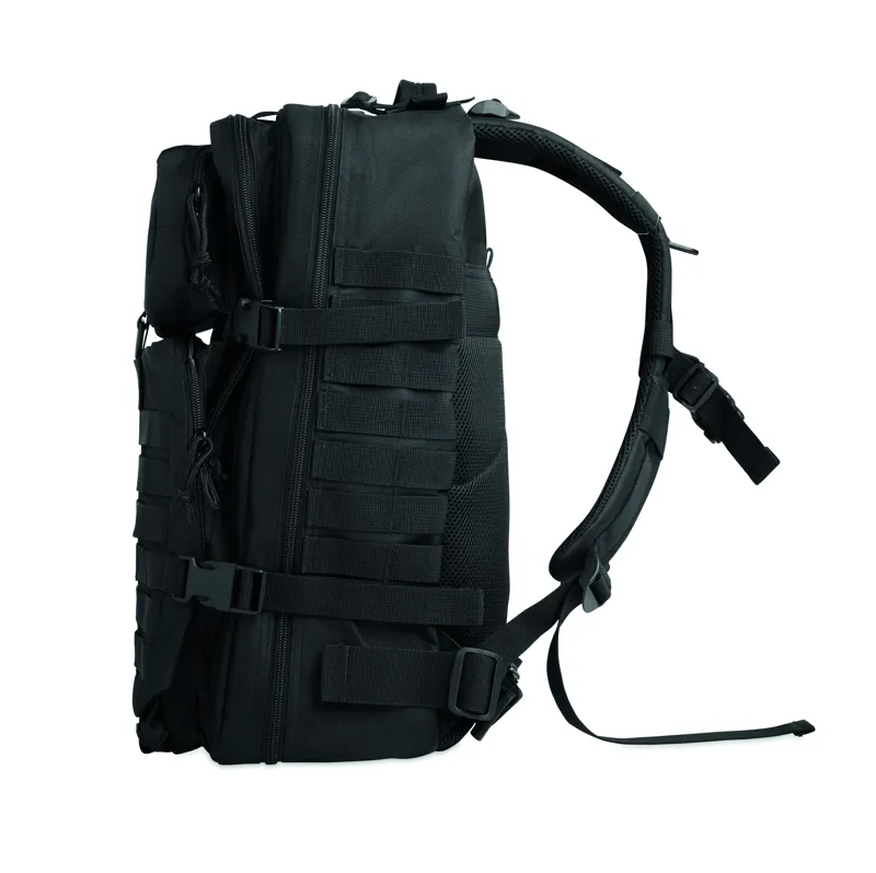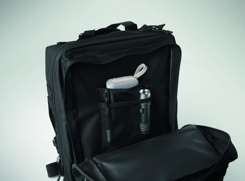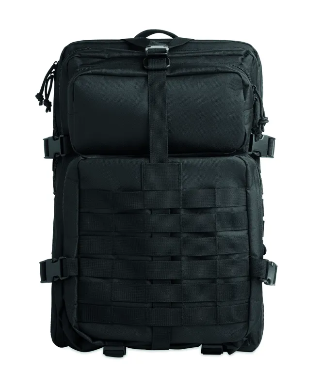600D RPET, 50 literes kültéri hátizsák, párnázott laptoprekesszel, több belső rekesszel. Cipzáras elülső zsebek, hálós párnázott pántok és hát, derékpánt, valamint rugalmas pántok kiegészítők számára.
