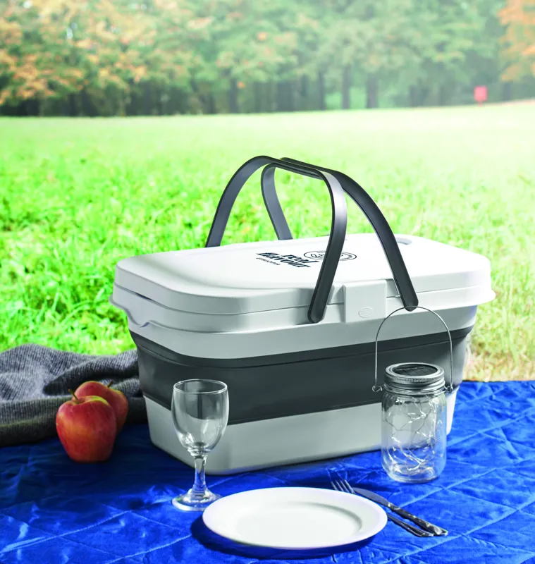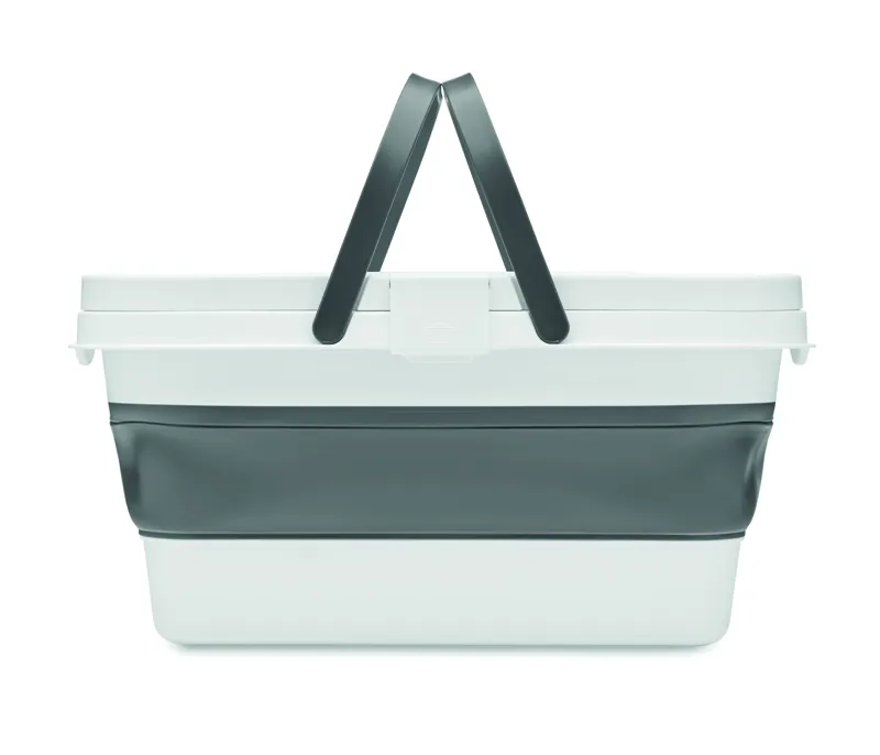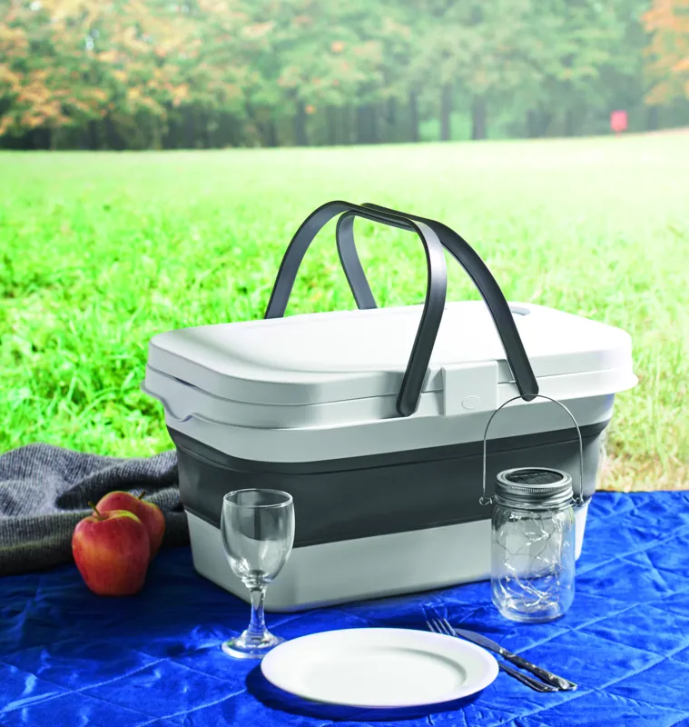 Összecsukható szilikon piknikkosár, asztalkaként is használható PP tetővel. Kapacitás: 16 l.