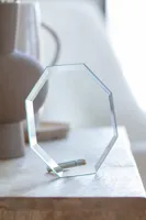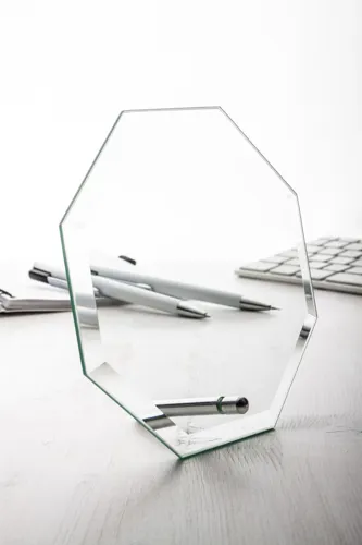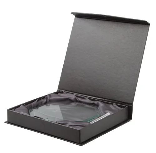 8 szögletű üveg trófea fém kitámasztóval. Szétszerelve, fekete díszdobozban szállítjuk.