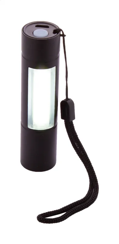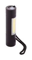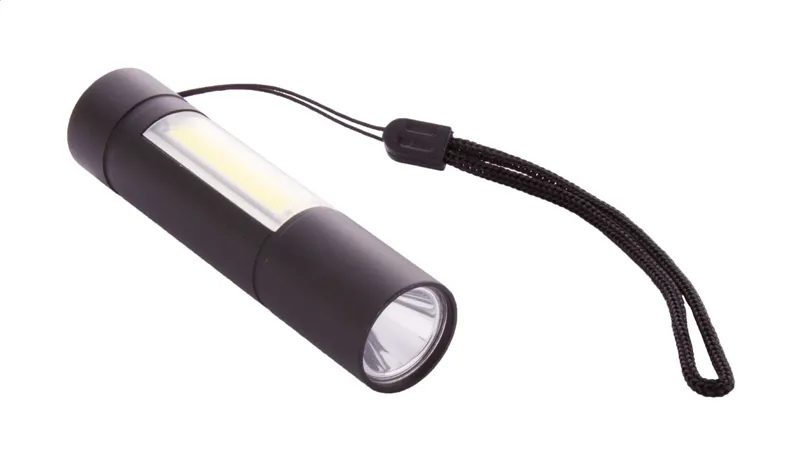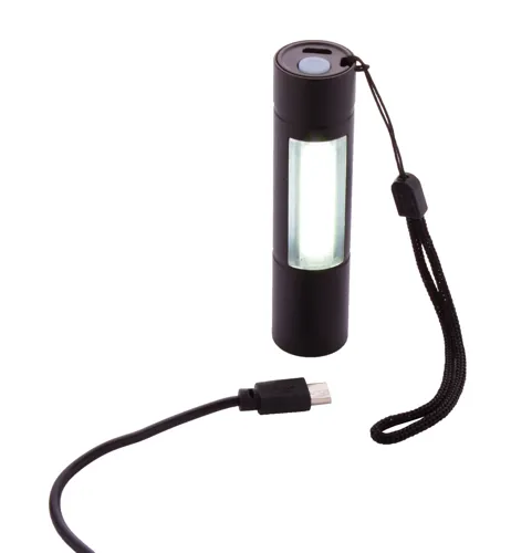 Alumínium zseblámpa beépített USB-s újratölthető akkumulátorral (400 mAh) és hordpánntal. Elején és oldalán nagy teljesítményű COB-lámpával. USB töltőkábellel szállítjuk. Fix és villogó fény móddal.