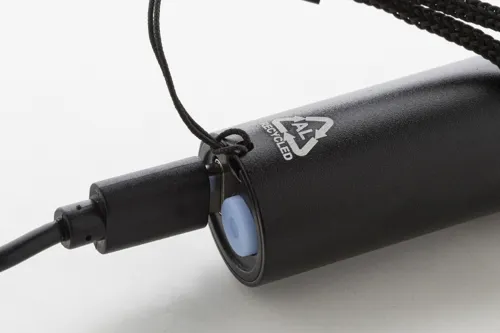 Újrahasznosított alumíniumból készült elemlámpa beépített USB-s akkumulátorral (400 mAh) és hordpánttal. Nagyítható, nagy teljesítményű COB fénnyel és 3 világítási móddal. USB töltőkábellel.