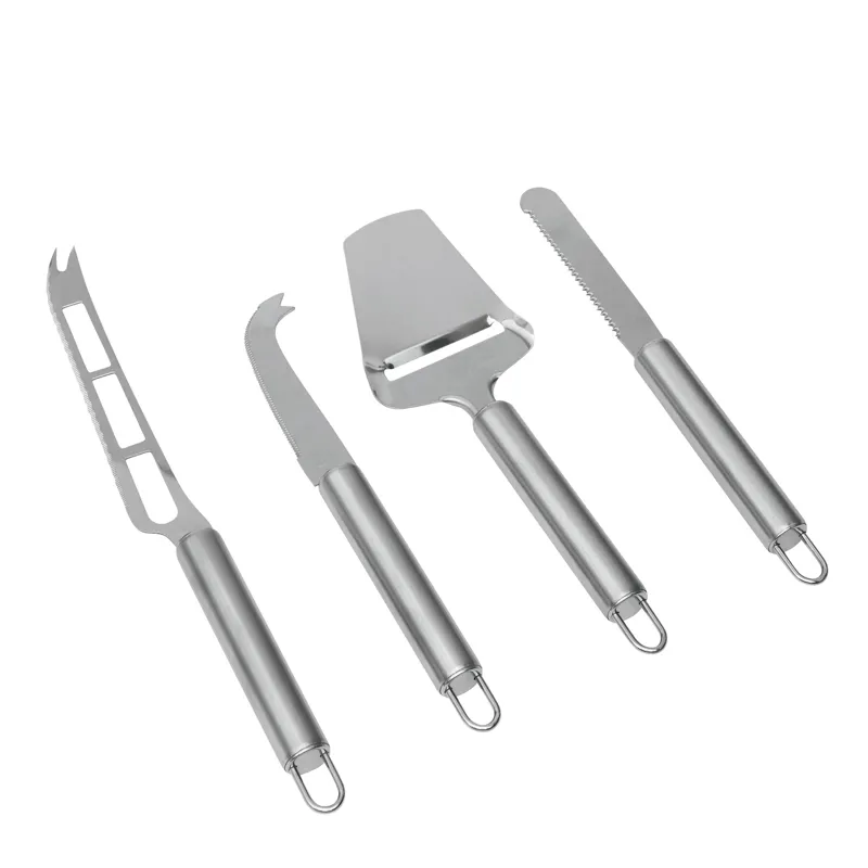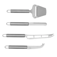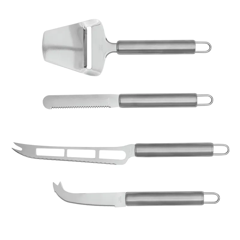 CHEESE sajtkés szett, tartalmaz két sajtkést lágy és keménysajthoz, sajtvágót és sajt lapátkát alján kissé lefelé hajlított végű késsel, mindegyik kés végén praktikus akasztóval, átlátszó fedelű dobozba csomagolva, az üveg tálca nem tartozék