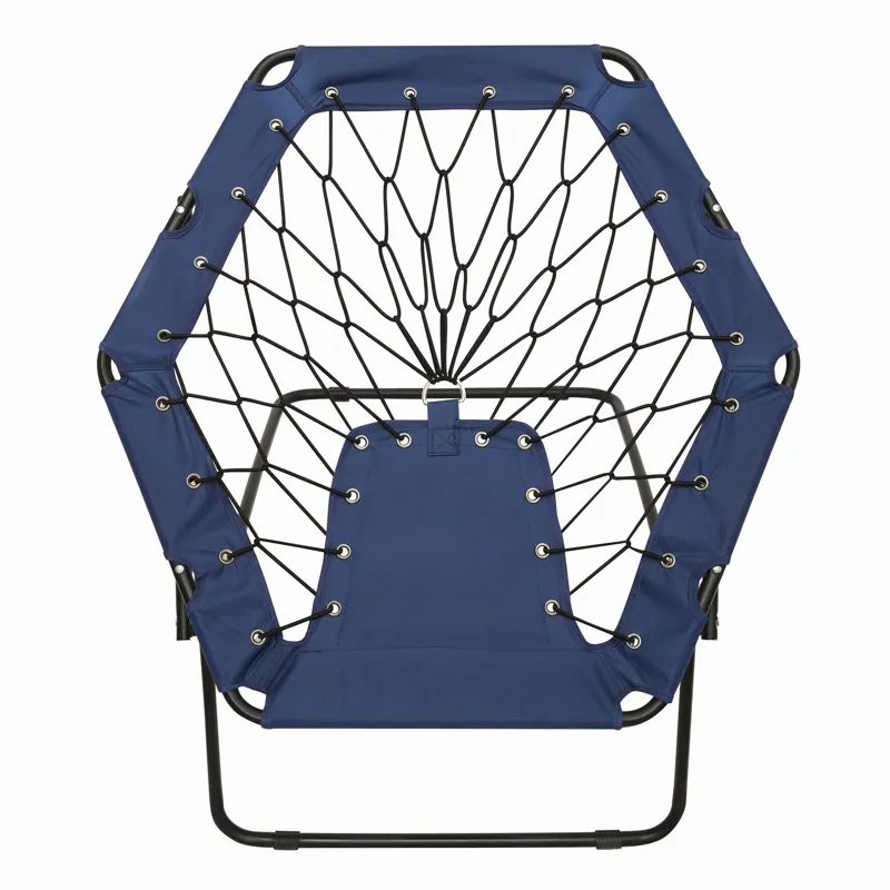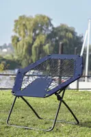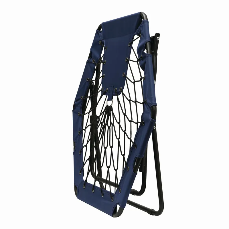 CHILL OUT hordozható szék gumikötelekkel: kényelmes ülés a rugalmas gumiköteleknek köszönhetően, erős acél kerettel, könnyen felállítható és laposra összecsukható