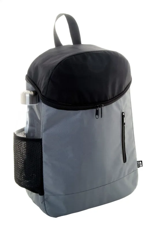 RPET hűtőtáska hátizsák alumínium béléssel, hálós oldalzsebekkel, cipzáras rekesszel és oldalzsebekkel. 600D RPET poliészter, megkülönböztető RPET címkével.