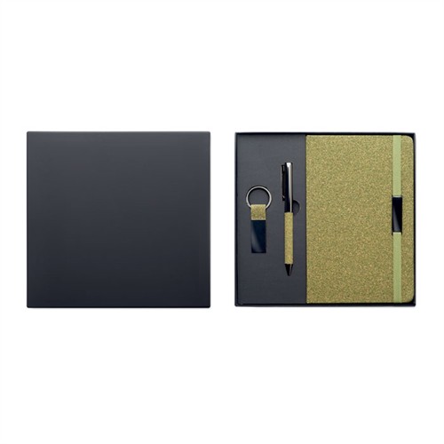 Ajándékkészlet, tartalma: A5 keménytáblás jegyzetfüzet 160 vonalas oldallal (80 lappal) 70 g/m² újrahasznosított papírból, csavarzáras fém golyóstoll és kulcstartó. 20% teazacc, 30% parafa és 50% poliészter-pamut részletek. Fém dekoráció az elasztikus zárópánton. FSC®-certified | FSC MIX CREDIT, N7.1, FSC-C213206