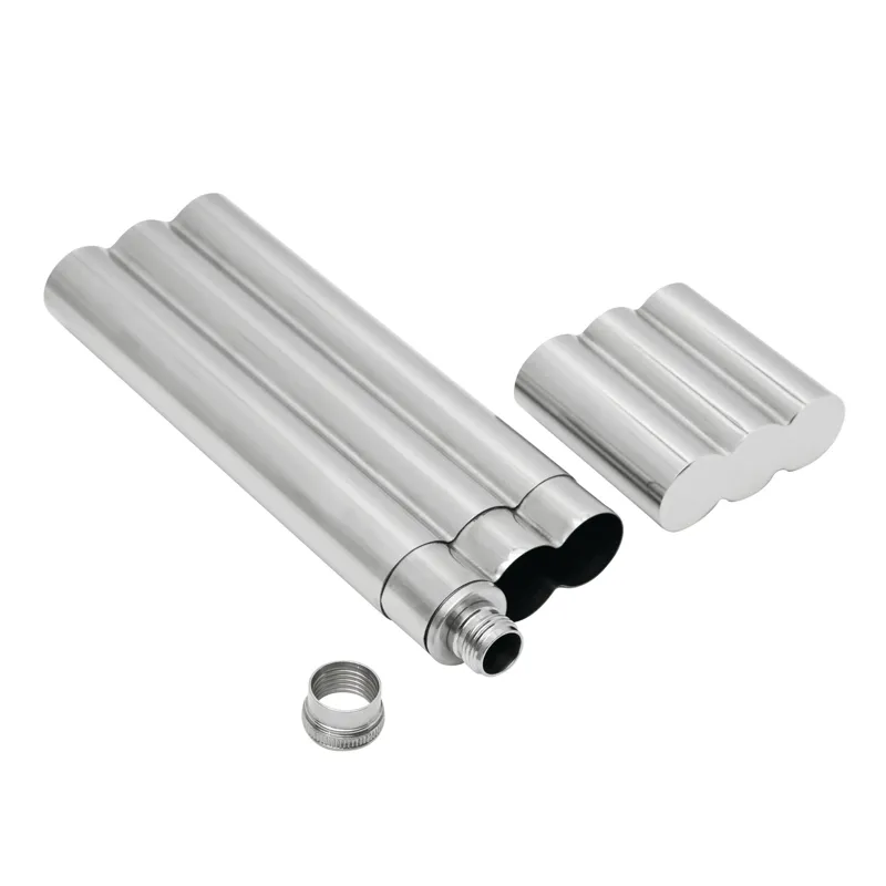 CIGAR STYLE laposüveg: rozsdamentes acél laposüveg kb. 60 ml űrtartalommal, a 2 db további rekesz szivarok biztonságos tárolására (kb. 20 mm átmérőjű szivarokhoz alkalmas)
