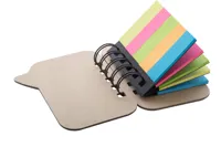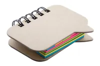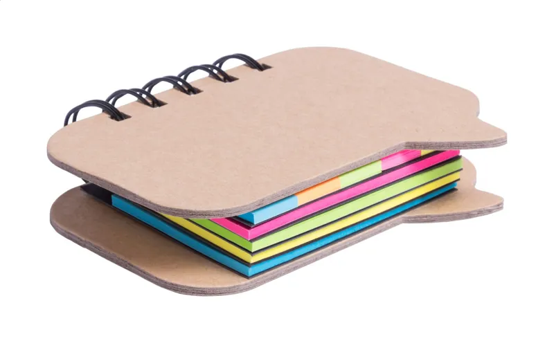 Különböző méretű öntapadós jegyzettömbök, újrahasznosított papírból készült, szövegbuborék alakú tokban (100 db 5,1×7,5 cm és 100 db 1,5×5,1 cm méretű).