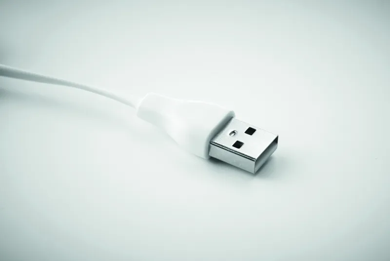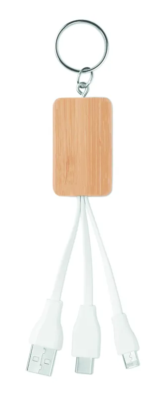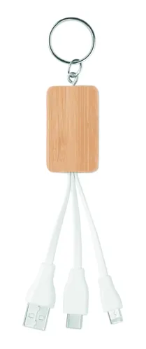 Kulcstartó bambusz borítással, USB-A, mikro-B és C típusú csatlakozókábellel. A bambusz természetes anyag, színében, mintázatában és méretében esetenként eltérő lehet.