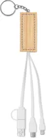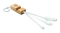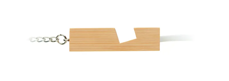 Bambusz kulcstartó telefonállvány funkcióval és töltőkábellel. Bemenet: 2 az 1-ben C-típusú és USB-A. Kimenet: C-típusú és mikro-B (2 az 1-ben).