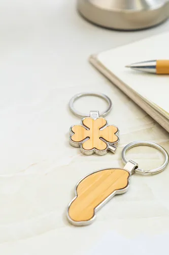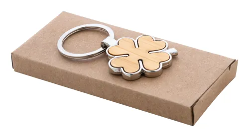 Fém négylevelű lóhere alakú fém kulcstartó bambusz betéttel. Kraft papír dobozban.