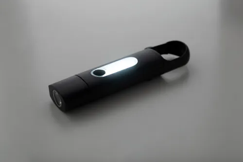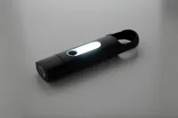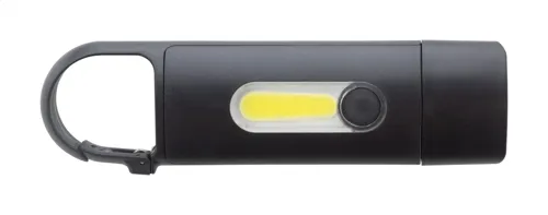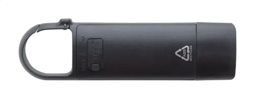 Újrahasznosított ABS mini zseblámpa beépített USB újratölthető akkumulátorral (200 mAh) és karabinerrel. COB lámpával az elején és COB reflektorral az oldalán. 3 világítási móddal. USB töltőkábellel.