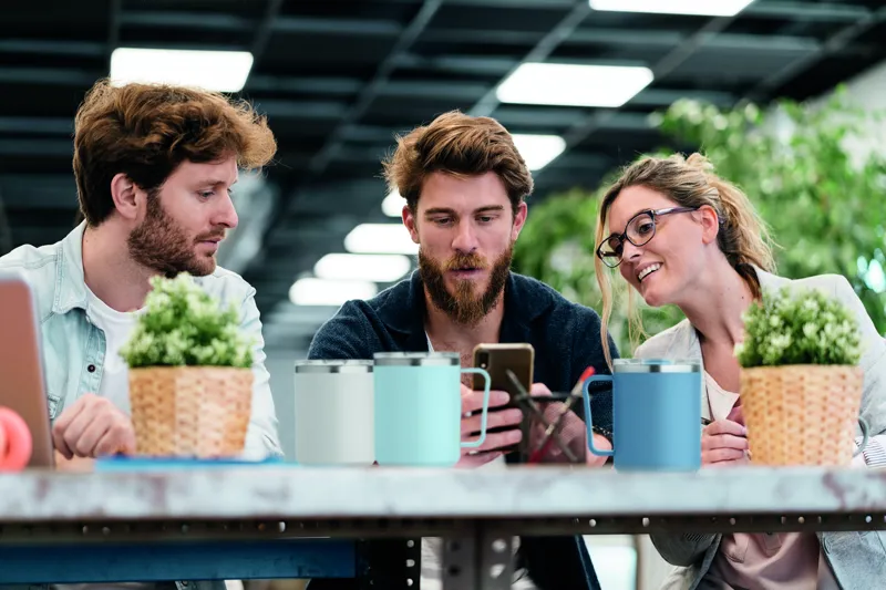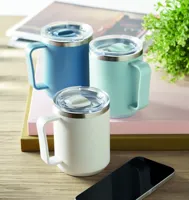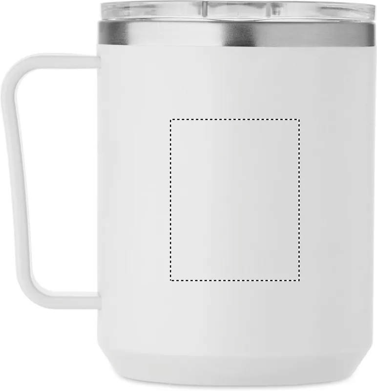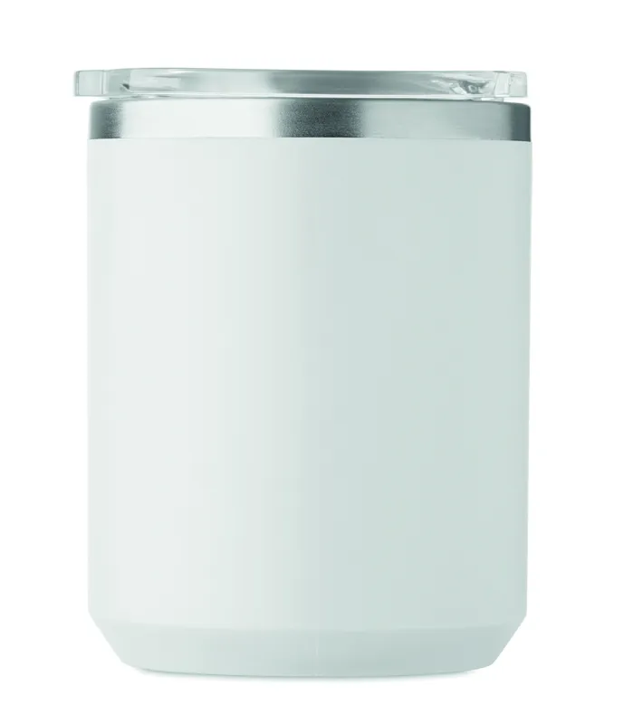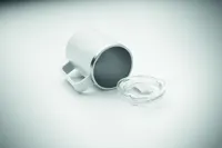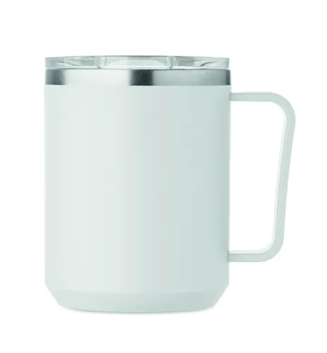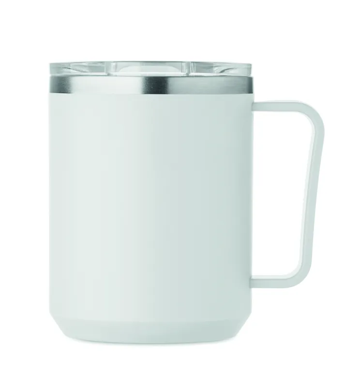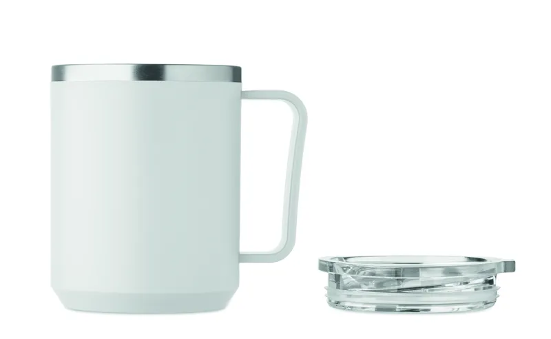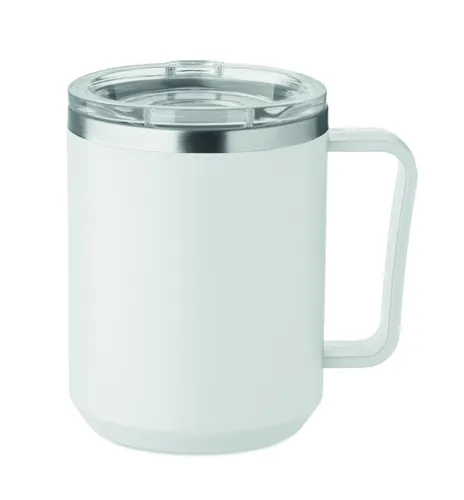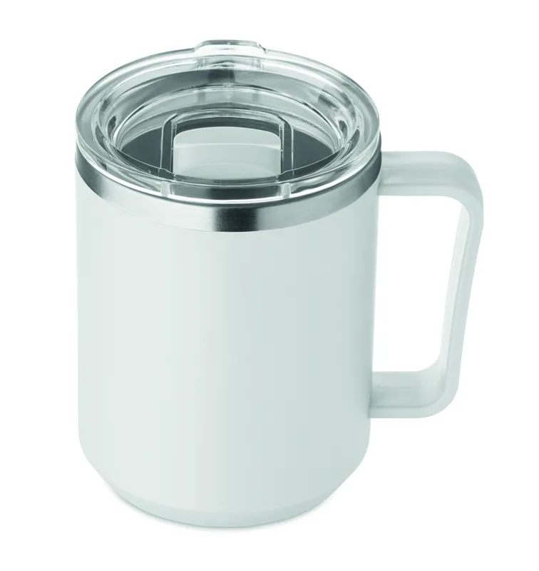 Duplafalú bögre 90 % újrahasznosított rozsdamentes acél és 10 % rozsdamentes acél belsővel, valamint újrahasznosított PP külsővel. Átlátszó AS fedél csúsztatható ivónyílással. Űrtartalom: 400 ml.