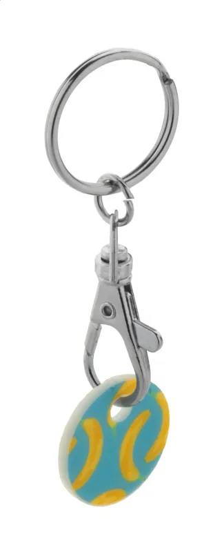 Fém karabineres kulcstartó full colour nyomtatott műanyag bevásárlókocsi érmével. Az ár tartalmazza az UV LED nyomtatást az egyik oldalon. Érme mérete: ø23×2 mm. Minimális rendelési mennyiség: 200 db.