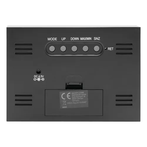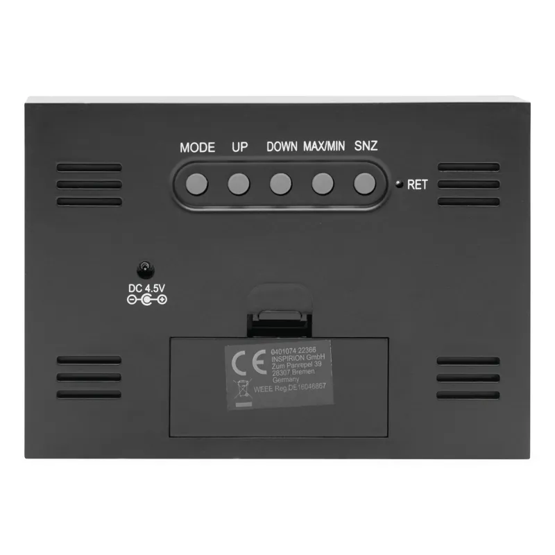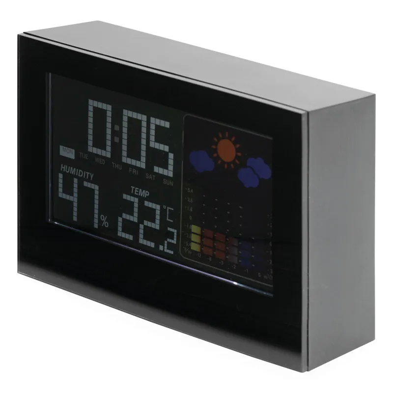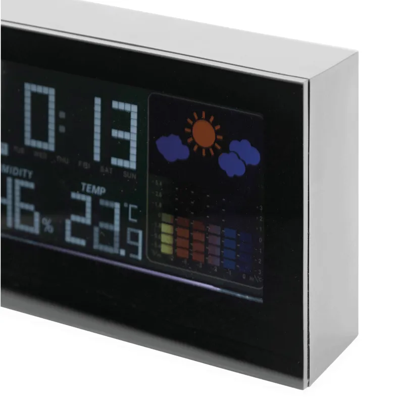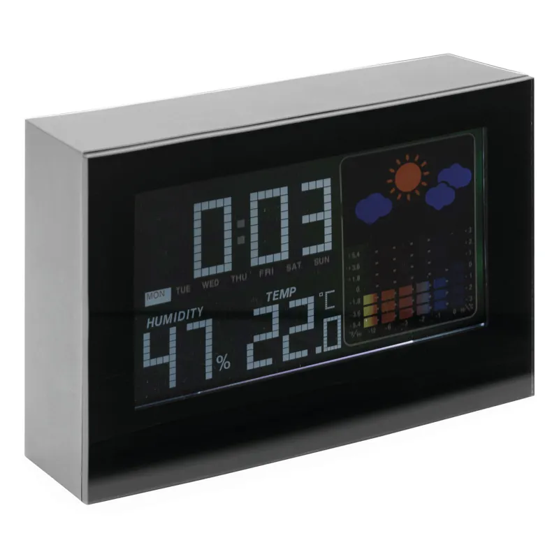COLOUR ébresztőóra időjárás előrejelzéssel, ébresztő funkcióval, dátum és óra kijelzéssel, hő- és páratartalom mérővel (°C és °F), érintésre kivilágosodó színes LCD kijelzővel, fekete háttérrel, adapterről is működtethető, ami nem tartozék