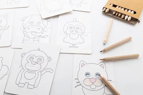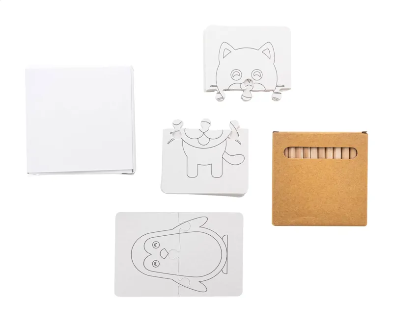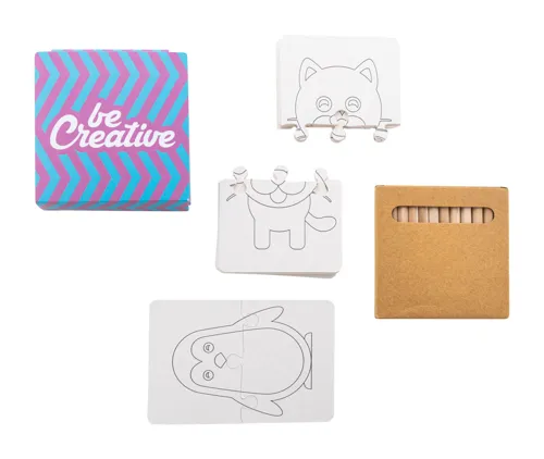 Egyedi gyártású, színezős karton puzzle készlet full colour nyomtatott papírdobozban. Fa színesceruzákkal (12 db) és 9 db kétrészes, állatos tematikájú puzzle kártyával. Minimális rendelési mennyiség: 100 db.
