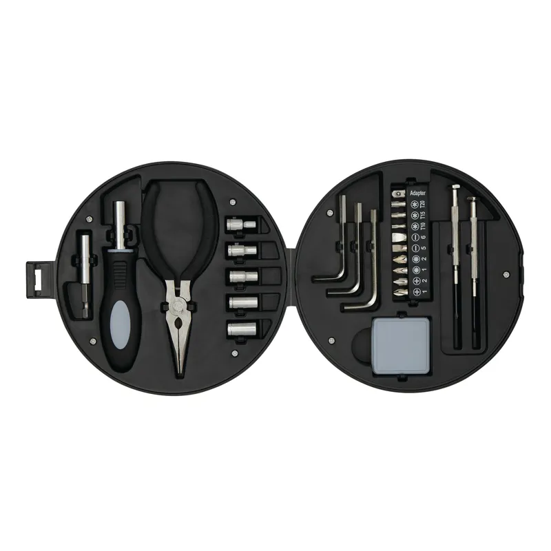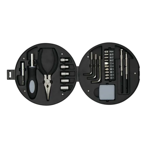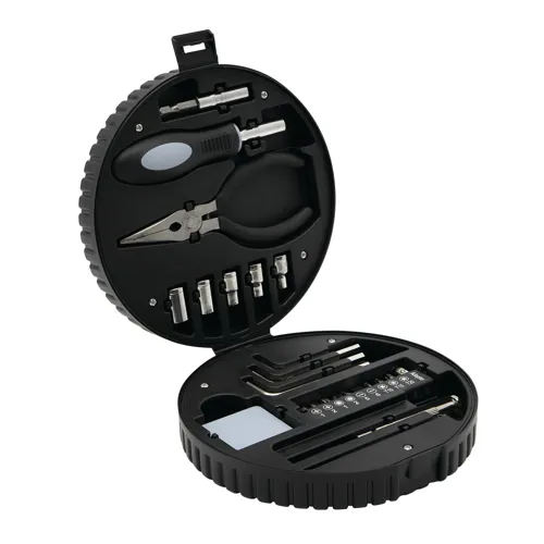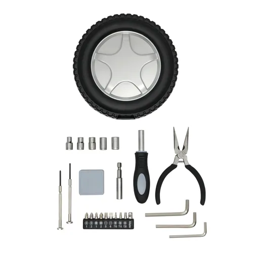 COMPACTY szerszámkészlet: tárolódoboz autógumi, abroncs kivitelben, 24 darabos (1 csavarhúzó, 1 fogó, 10 részes bitkészlet, 5 foglalat, 3 hatlapfejű csavarkulcs, 2 precíziós csavarhúzó, 1 mérőszalag)