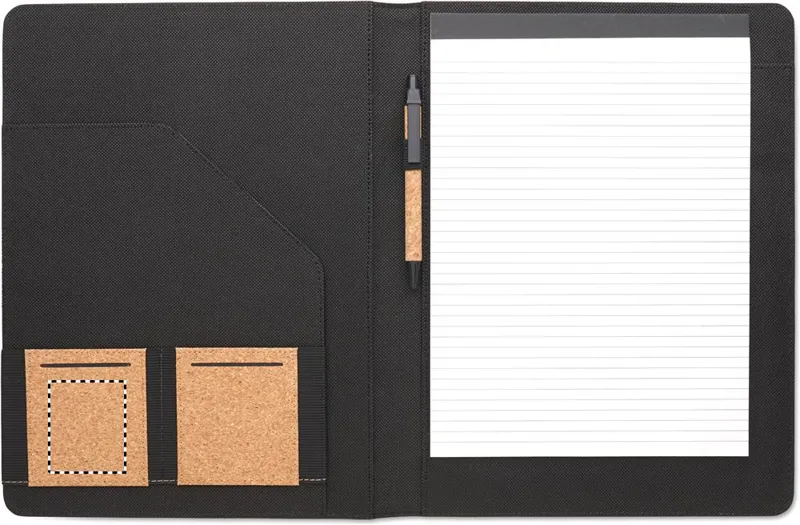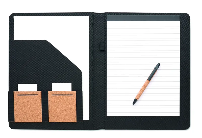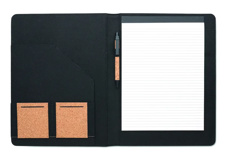 A4 parafa iratmappa. Cserélhető A4 jegyzettömb, 30 újrahasznosított papírból készült vonalas lappal. Illeszkedő színű toll és tolltartó hurok. 2 kártyatartó és egy nagy rekesz.