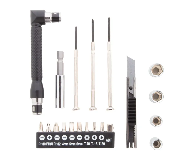21 darabos szerszámkészlet bambusz dobozban. 1 csavarhúzó markolatot, 1 papírvágó kést, 3 precíziós csavarhúzót, 10 bitfejet tartóban, 4 darab dugókulcs fejet és 1 hosszabbítót tartalmaz.
