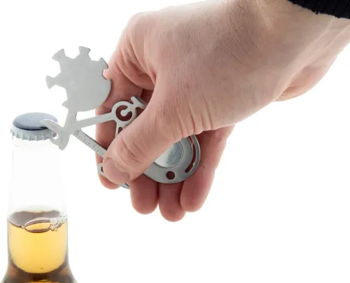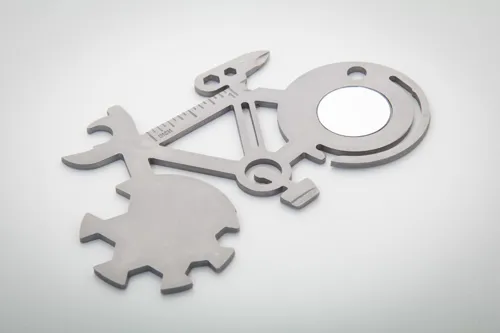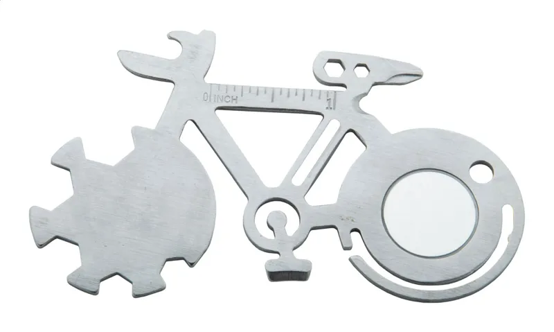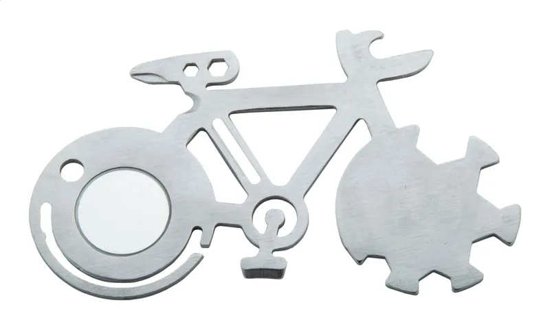 Rozsdamentes acél, kerékpár alakú multiszerszám 11 funkcióval.