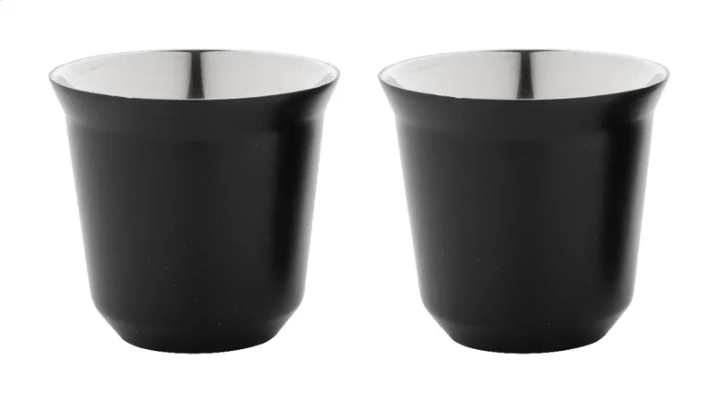 2 darabos eszpresszó csésze szett kávékapszula alakú, duplafalú, hőszigetelt thermo csészékkel, újrahasznosított rozsdamentes acélból, 80 ml. Kraft papír dobozban.