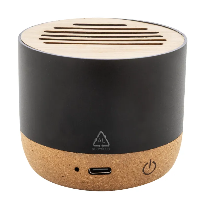 Vezeték nélküli hangszóró újrahasznosított alumínium házban, bambuszhálóval és természetes parafa talppal. Újratölthető akkumulátorral (400 mAh). USB töltőkábellel.