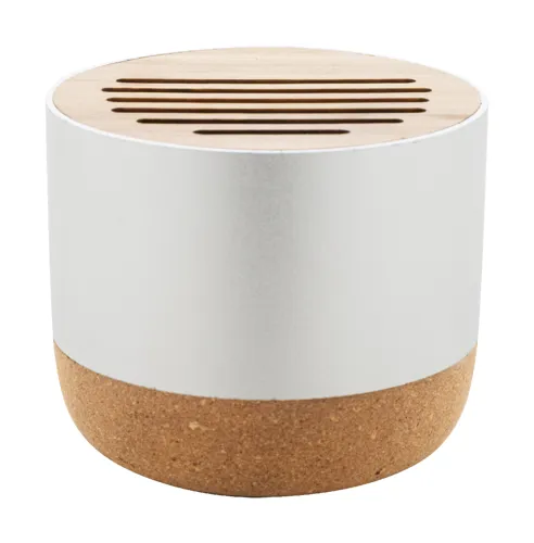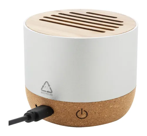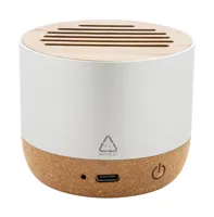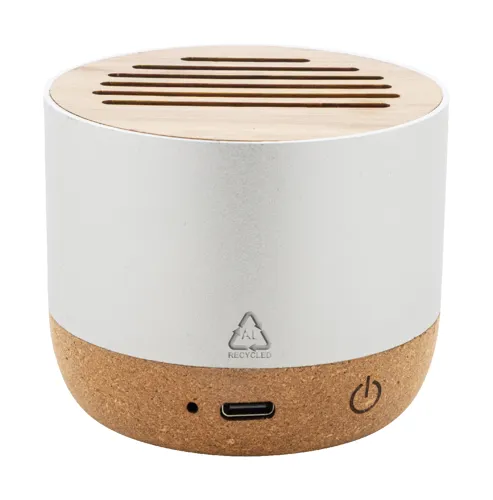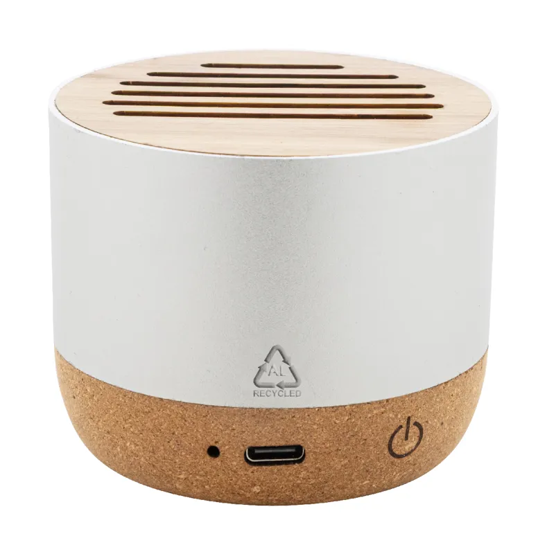 Vezeték nélküli hangszóró újrahasznosított alumínium házban, bambuszhálóval és természetes parafa talppal. Újratölthető akkumulátorral (400 mAh). USB töltőkábellel.