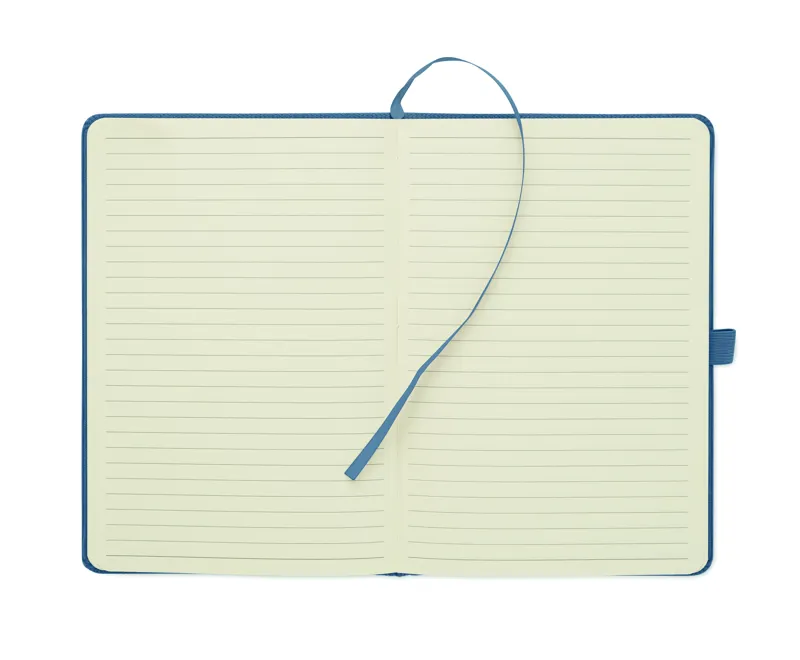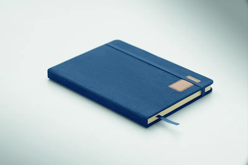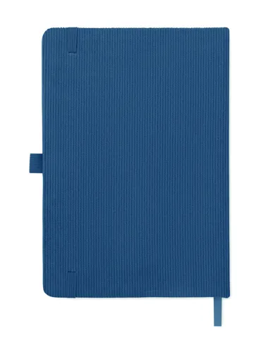 A5 jegyzetfüzet RPET kordbársony keménytáblás borítóval. 192 vonalas oldal újrahasznosított papírból (70 g/m²). Cérnafűzött, elasztikus zárópánt és tolltartó, könyvjelző szalag, kraftpapír címke.