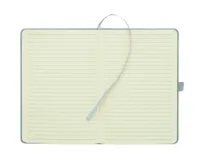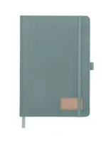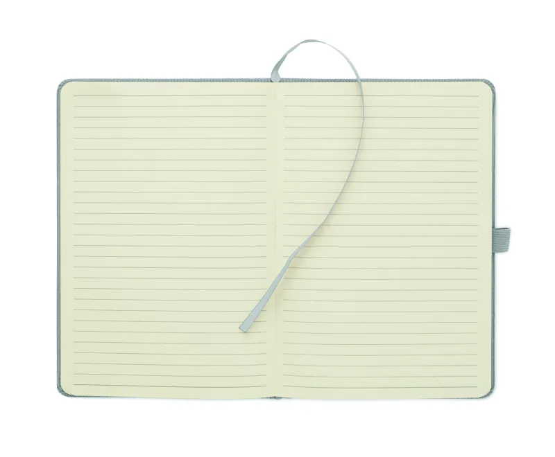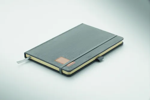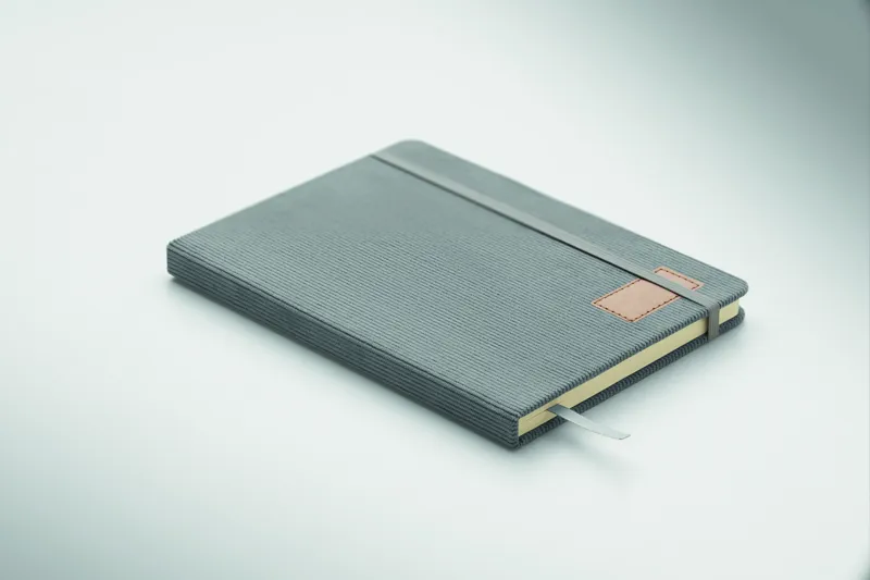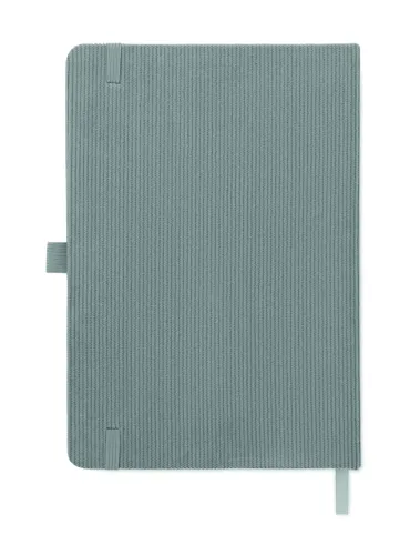 A5 jegyzetfüzet RPET kordbársony keménytáblás borítóval. 192 vonalas oldal újrahasznosított papírból (70 g/m²). Cérnafűzött, elasztikus zárópánt és tolltartó, könyvjelző szalag, kraftpapír címke.