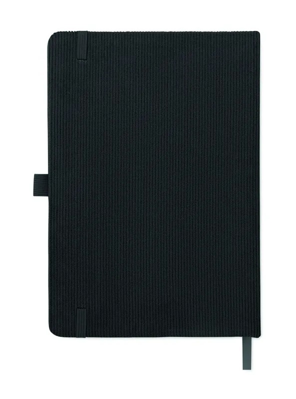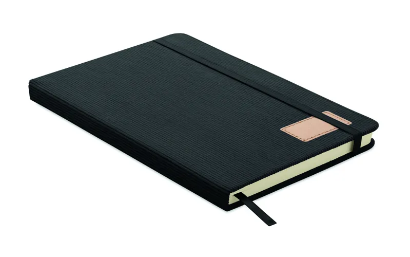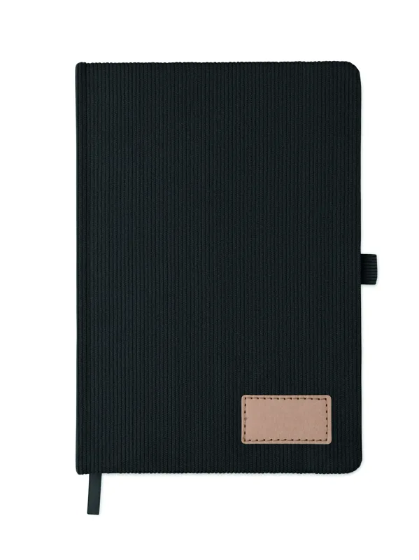 A5 jegyzetfüzet RPET kordbársony keménytáblás borítóval. 192 vonalas oldal újrahasznosított papírból (70 g/m²). Cérnafűzött, elasztikus zárópánt és tolltartó, könyvjelző szalag, kraftpapír címke.