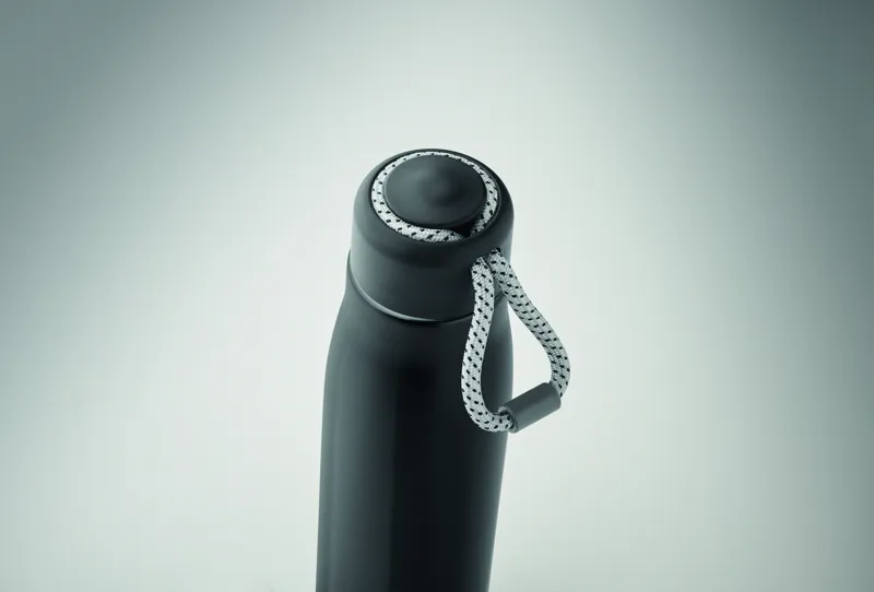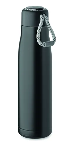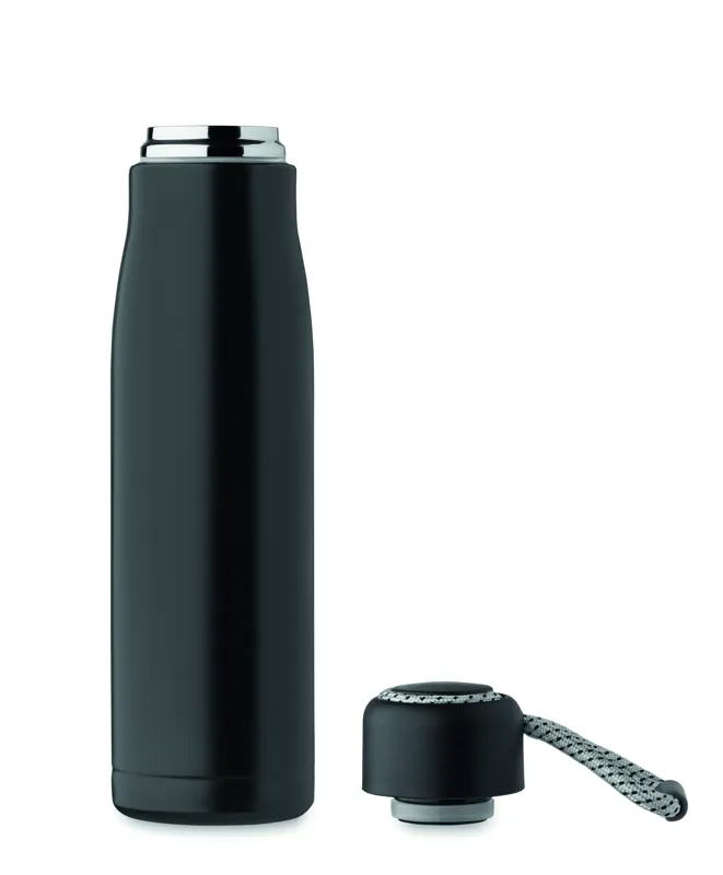 Duplafalú, újrahasznosított rozsdamentes acélból készült termoszpalack (90% újrahasznosított rozsdamentes acél és 10% rozsdamentes acél), zsinóros PP fedéllel. Szivárgásmentes. Űrtartalom: 500 ml.
