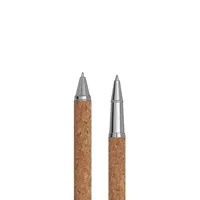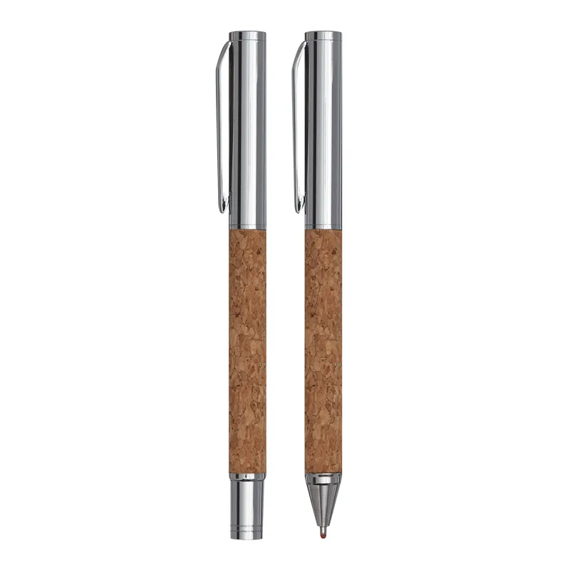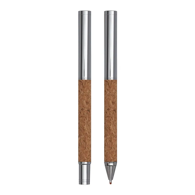 CORK SIGNATURE toll szett: fém golyóstollból csavaró mechanizmussal (kék tinta) és fém rollerball tollból (fekete tinta) áll – parafa markolatrész, parafa díszdobozban szállítjuk