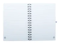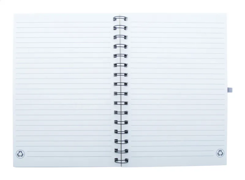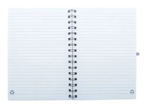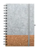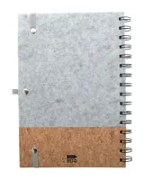 RPET filc és természetes parafa borítású jegyzetfüzet újrahasznosított papírból készült 70 vonalas lappal, gumipánttal és tolltartóval. A5 méretű.
