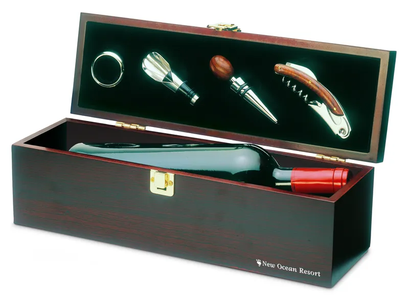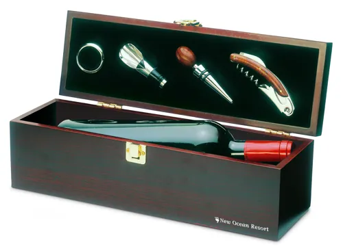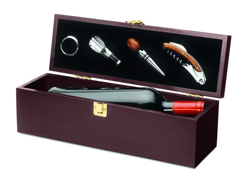 Boroskészlet, egy üveg bor elhelyezésére is alkalmas fából készült dobozban. Cseppfogó gyűrűt, kiöntőt, palack visszazárót, és dugóhúzót tartalmaz. Borosüveg nélkül szállítjuk