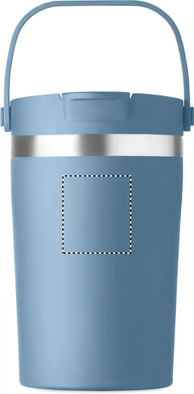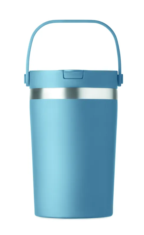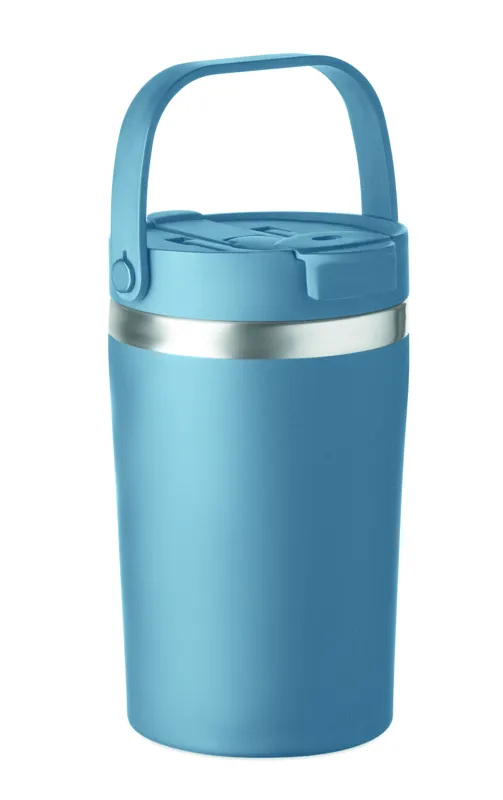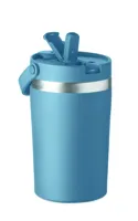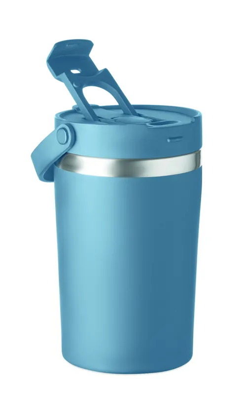 Duplafalú, újrahasznosított rozsdamentes acél (90% újrahasznosított rozsdamentes, 10% rozsdamentes acél) pohár PP 2 az 1-ben ivónyílással és szívószálas fedéllel. Szivárgásmentes. Űrtartalom: 350 ml.