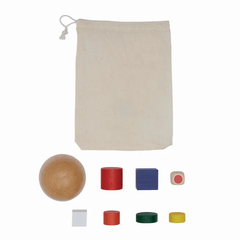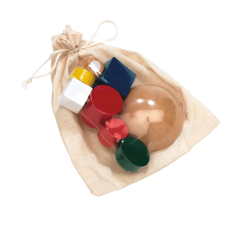 CRAZY TOWER ügyességi játék, tartalmaz egy kis félkör alakú labdát, 6 db formát és egy kockát, környezetbarát vászontasakba csomagolva