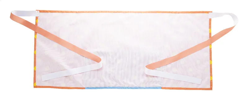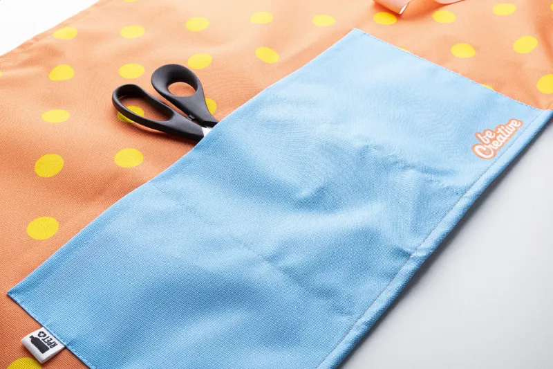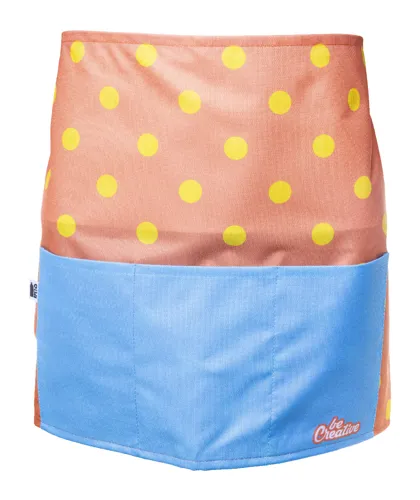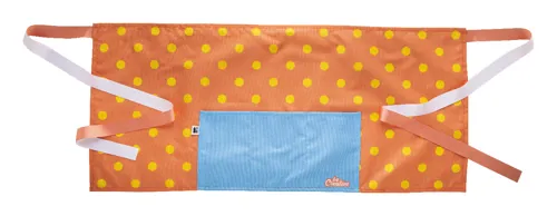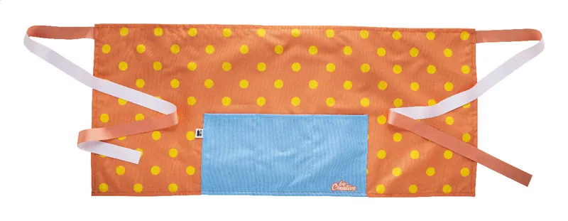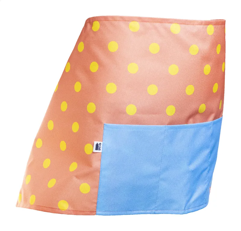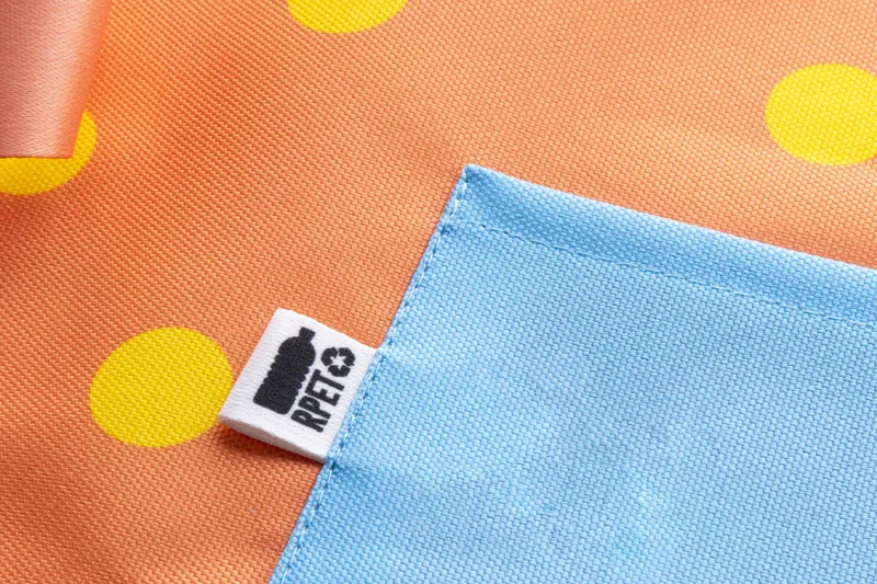 Egyedi gyártású, 600D RPET poliészter felszolgáló kötény három elülső zsebbel, teljes felületén szublimációs grafikával és megkülönböztető RPET címkével. Minimális rendelési mennyiség: 25 db.