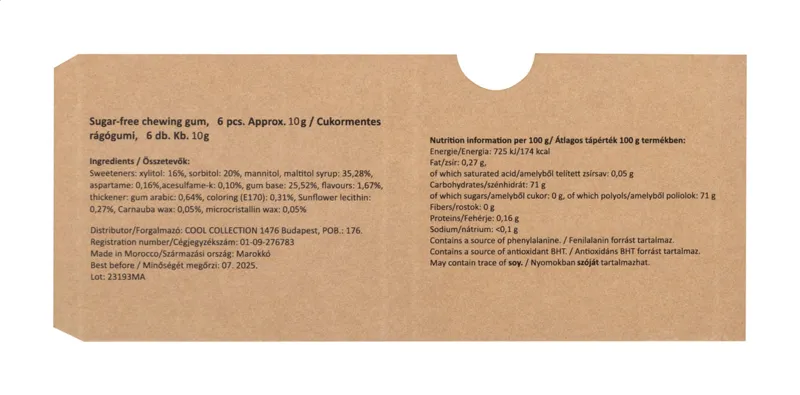 6 db cukormentes rágógumi buborékcsomagolásban, egyedi gyártású, full-colour nyomtatott kraft papír borítással. Minimális rendelési mennyiség: 100 db.