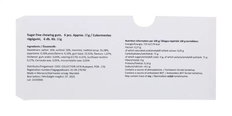 6 db cukormentes rágógumi buborékfóliában, egyedi gyártású, full colour nyomtatott papírgyűrűvel. Minimális rendelési mennyiség: 100 db.