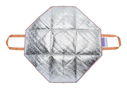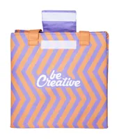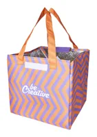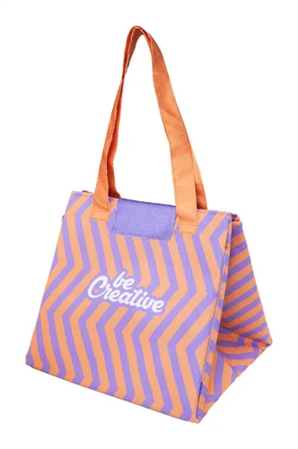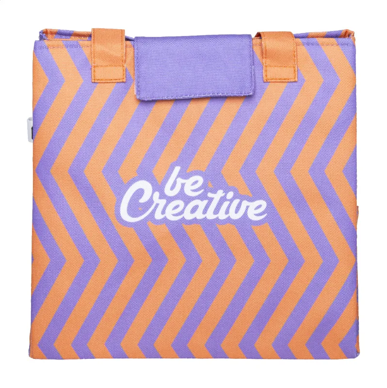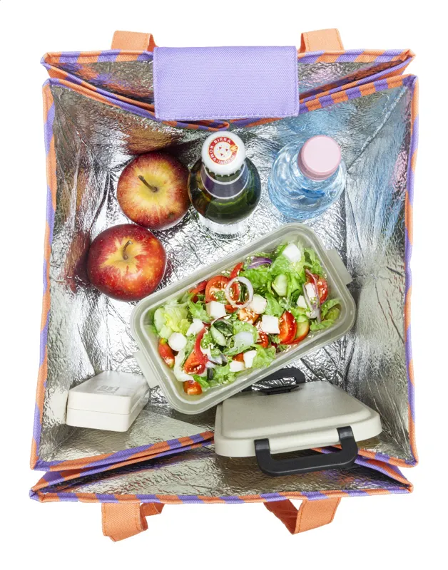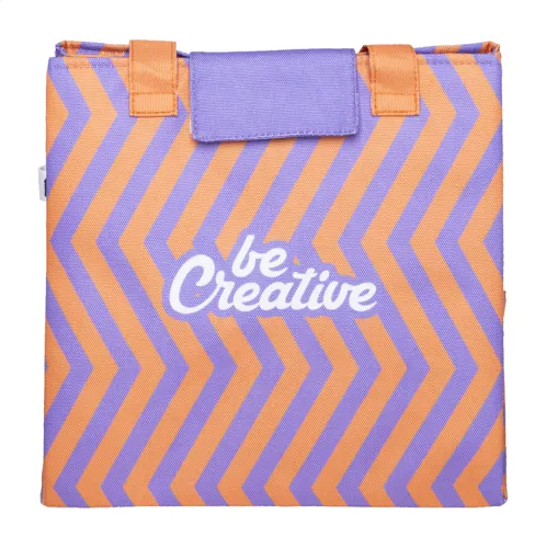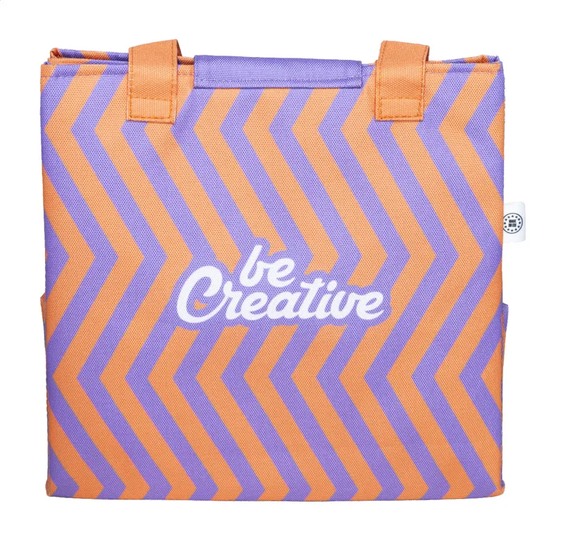 Egyedi gyártású, 600D RPET poliészter hűtőtáska alumínium béléssel, tépőzárral és hosszú fogantyúval. Kosárként és pikniktakaróként is használható. Teljes felületén szublimációs nyomtatott grafikával és megkülönböztető RPET címkével. Minimális rendelési mennyiség: 25 db.